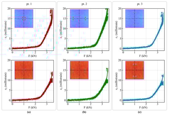 Figure 5a corresponds to the middle, close-to-centre points (pt. 1, coloured red in Figure 2c), the centre column plot (Figure 5b) corresponds to the horizontal far-from-centre points (pt. 2, coloured green) and the right column plot (Figure 5c) corresponds to the vertical far-from-centre points (pt. 3, coloured blue in Figure 2c). Since three specimens were tested, this yielded twelve curves for each plot, and as seen from the figure, the discrepancy between the curves is within 5 × 10−4. This means that the repeatability of the measurements is high and that the specimens’ response is relatively symmetrical.