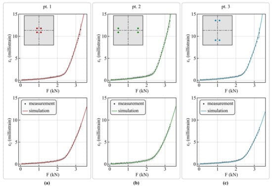 Comparison of simulated and measured responses of the heterogeneous specimen test: (a) max./min. strain–force response at the close-to-centre points (pt. 1), (b) max./min. strain–force response at the horizontal far-from-centre points (pt. 2), (c) max./min. strain–force response at the vertical far-from-centre points (pt. 3).