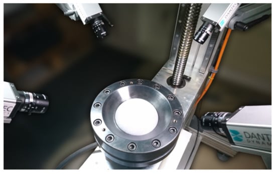 The proposed methodology was verified by conducting a bulge test according to ISO 16808 [], with which the identified values can be directly compared. The bulge tests (Figure 7) were performed using custom-built hydraulic testing equipment consisting of a chamfered die with a 160 mm opening and a circular steel base with a drawing bead to constrain sheet metal from moving towards the centre of the die. Before the pressurization, the die is tightened to the base plate with twelve bolts. During the pressure increase, the deformation of the bulge is monitored with a multi-cam DIC system which is synchronized with the pressure sensor. The multi-cam optical measuring setup is presented in Figure 7 and the settings were set to surpass the ISO 16808 optical system requirements. Three specimens were tested up to a pressure of 16 MPa at which no specimen rupture occurred. The strains were measured along with the sheet’s rolling and transverse-to-rolling direction.
