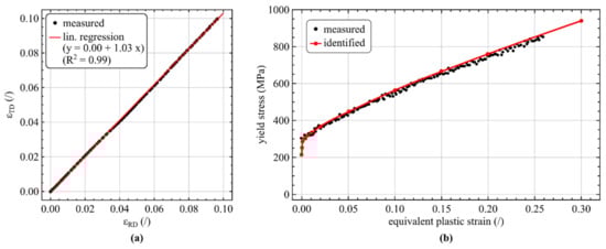 For the inverse identification process, finite element simulations of a heterogeneous specimen test were conducted in ABAQUS/Standard. A quarter model with 10,000 quadrilateral finite elements was used in the simulations. Logarithmic strain versus tensile force was monitored at the locations of characteristic points: pt. 1, pt. 2 and pt. 3. Furthermore, in the optimization procedure, the objective function was defined as a sum of the squared differences between the simulated and the measured data points of strain–force curves. The data of all six characteristic strain–force curves in the force range from 2.5 kN to 3.2 kN were included in the objective function definition. The gradient-based Levenberg-Marquardt optimization method was utilized to minimise the objective function, where the Jacobian matrix was calculated by the finite difference method. The identification procedure was started with initial values {1,1} for and , and after three iterations, the minimum of the objective function was reached. The parameters are reported in Table 3. Moreover, because gradient methods are prone to reach local minima instead of a global one, the optimization process was repeated several times with different starting values. However, the same result was obtained each time in a few iterations.