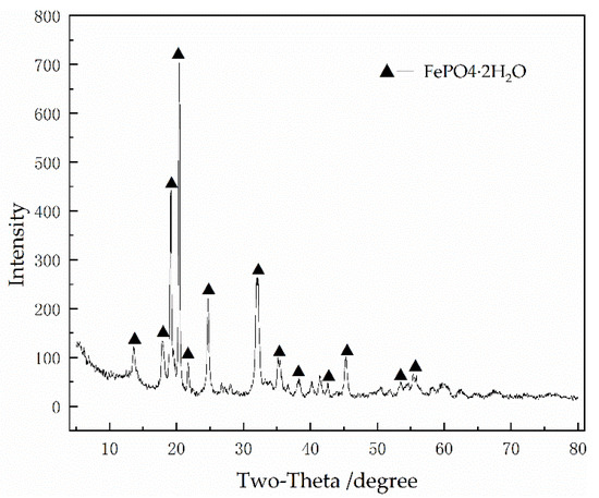 On the basis of pre-roasting, the leaching ratios of Ni and Co reached 99.28% and 90.88% respectively, while that of Fe was only 3.29%, which was slightly different from the previous experimental results. The leaching results in this study and the previous leaching results are shown in Table 3. Finally, the Fe3+ in the leaching solution combined with the phosphate to form the iron phosphate (Figure 4) and entered the leaching residue, realizing the selective leaching of Ni and Fe under atmospheric pressure, and the ideal leaching ratio was achieved.