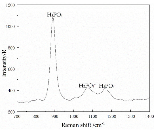 The results of Raman spectrum show that there are unionized H3PO4 and ionized H2PO4− in the leaching solution (Figure 5). By studying the ionization process of phosphoric acid, we can tell that in addition to H3PO4 and H2PO4−, there is a small amount of HPO42− and PO43− in the solution. It can be seen from Figure 6 that under the same concention of H3PO4, the pH of phosphate precipitation of each metal ion is different, which results in the precipitation sequence of different metal ions being different. By adjusting the pH value of the solution, the metal ions in the solution can generate phosphate precipitation to achieve the purpose of preliminary removal of impurity ions. At the same time, in the solvent extraction process, the pH value of the solution also needs to be adjusted to a suitable range, to have a better extraction effect. Because ammonia does not contain other impurity metal ions, it will not add impurity ions to the subsequent extraction process, and the pH adjustment process is easy to control, because of its weak alkalinity, and ammonia is selected to adjust the pH value of the solution to observe the precipitation effect of metal ions at different pH values and the effect of pH value on the extraction of metal ions in the solution.