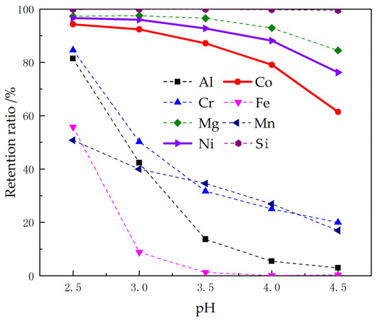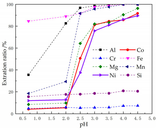 It can be seen from Figure 8 that when P204 was used as an extractant, silicon and chromium were not easily extracted, while the extraction ratios of other metal ions increased with the increase of pH value. In the extraction process, Al3+, Fe3+ and Mn2+ would be preferentially extracted by P204. When the pH value reached 3.0, the extraction ratios of Al3+, Fe3+ and Mn2+ were 98.47%, 99.59% and 97.56%, respectively, and the extraction ratios of Ni2+, Co2+ and Mg2+ were 75.72%, 81.14% and 81.96%, respectively.