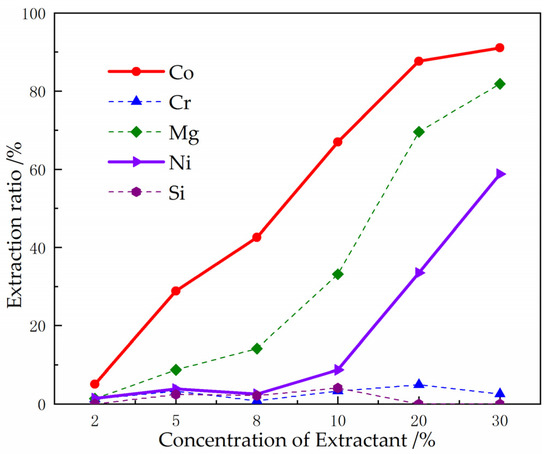 P507 has a much stronger extraction capacity for cobalt than for nickel [26]. In order to achieve the selective separation of Ni2+ and Co2+ in the extraction solution, P507 was selected as the extractant to extract Co2+ from the solution after removing impurity. The effect of P507 concentration on the extraction effect of various metal ions in the leaching solution was investigated. The extraction result is shown in Figure 11.