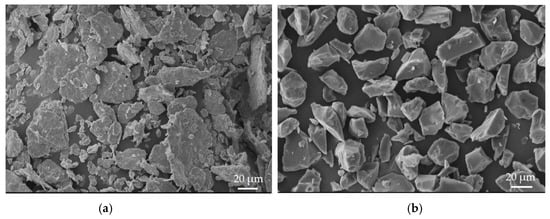 Commercial Fe and B4C powders were used as the matrix and reinforcement, respectively, for the fabrication of composites. From the point of view of the reaction between the iron and boron carbide powders, the selected particle sizes of both powders were nominally similar to promote high diffusion rates between iron and boron carbide. The iron particles, manufactured by AEE (Atlantic Equipment Engineers, (Upper Saddle River, NJ, USA), were mixtures of irregular angular shape and flake geometry with a median particle size () of 28.6 µm. The particles of B4C powder, manufactured by AEE, showed an irregular polygonal and angular morphology with a median particle size () of 30.8 µm. The particle size distributions of the raw powders were determined by a laser diffraction particle-size analysis (Mastersizer 3000, Malvern Panalytical Ltd, Malvern, UK). The results of the particle size distributions are listed in Table 1. The supplied information about the powders was presented in SEM images, seen in Figure 1.