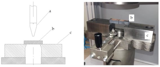 Powder metallurgy test specimens were prepared as un-notched, in accordance with the ASTM E23 and ASTM B925 standards. Charpy impact tests were carried out on the low-velocity drop weight test device (CEAST Fractovis Plus, Instron, Norwood, MA, USA) at room temperature. Blocks of composites were cut into slices by wire erosion and freely supported on anvils of the Charpy impact fixture, as shown schematically in Figure 3. The Charpy fixture and impactor are fully suited to the ASTM-E23 standards. The impactor head hit the specimen surface perpendicular to the powder-compacting direction.