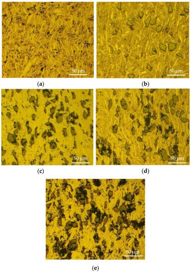 Figure 4 shows the optical micrographs of hot press-compacted Fe/B4C composites (0 vol.%, 5 vol.%, 10 vol.%, 20 vol.%, and 30 vol.% B4C) before the sintering process. The breakage of B4C particles was observed over the 5 vol.% B4C reinforced composites seen in Figure 4c–e, which might have occurred during the mixing or compacting stages.