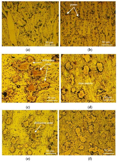 One of the remarkable microstructure observations was the formation of irregular and acicular (needle-shaped) diffusion zones, as seen in the composite specimens of Figure 5c–f and Figure 6, formed as a result of the diffusion of boron atoms into the iron matrix during sintering. In particular, distinctive formations were observed in 5 vol.% and 10 vol.% B4C reinforced composites. These in-situ reinforcement phases originated from the B4C particles and randomly scattered close to the boundaries of the B4C particles in the matrix. A similar situation was observed by Turov et al. [16].