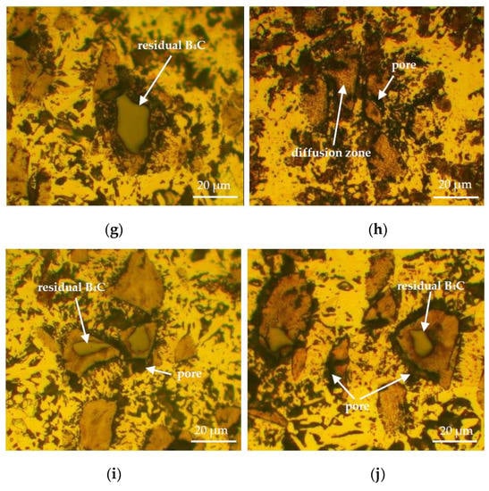 - The crack propagation and fractured surface morphologies were affected by the distribution and the presence of diffusion zones, porosity, and the residual B4C particles. When the bonding between the newly formed phases and the matrix was stronger, fracture occurred by the breaking of residual particles.