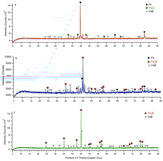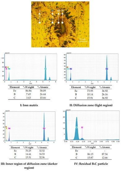 Energy-dispersive X-ray Spectroscopy (EDS) analysis, performed at different points of the diffusion zone (I–IV) (Figure 6), confirmed the presence of FeB and Fe2B phases, which formed during the reaction between Fe and B4C. Boron contents decreased from the origin of diffusion (or residual B4C particles) to the iron matrix. The EDS analysis revealed that the darker regions of the diffusion zone contained more boron (B) atoms, probably due to the existence of an FeB-intensive phase (Figure 6III), whereas the Fe2B phase is more dominant in the relatively light-colored region (Figure 6II). The XRD analysis, shown in Figure 7, revealed that the composites comprise the Fe2C and iron boride phases (Fe2B and FeB). In particular, the intensive Fe2B phase was observed in the Fe + 30 vol.% B4C composite.