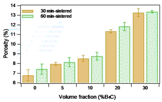 As seen in Figure 8, enhanced porosity was observed as the reinforcement increased, and sintering duration did not have a noticeable effect on porosity. It was concluded that the reinforcement ratio was the effective factor for porosity. The differences between the iron and B4C particle geometries increased the voids. This difference may occur during the compaction stage; in particular, it can be more effective at high reinforcement ratios. Harder B4C powder has a greater effect on the compression behavior of the mixture, as a higher ratio of B4C is more resistant to compressibility than the iron powder. Another reason for the porosity was the dissociation of boron carbide particles from the contacted iron matrix after sintering the Fe-B4C powder mixtures, defined as diffusion porosity [29]. The increase of porosity also reduces the fracture energy, as it reduces the cross-sectional area exposed to fracture.