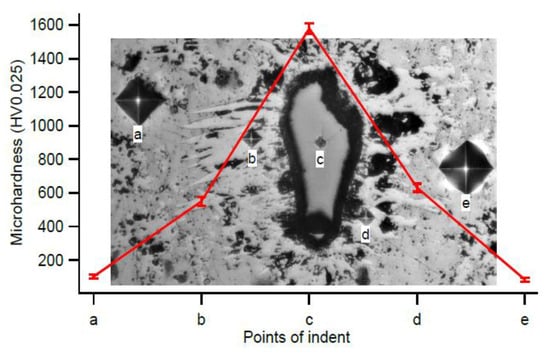 Hardness differences of the matrix and diffusion zones were demonstrated by the Vickers microhardness measurements (HV0.025). The variations of hardness and the traces of the Vickers indenter can be seen in Figure 10. The hardness varies throughout the diffusion zone, with the lowest value in the matrix and the highest one on the the B4C particles. The average hardness of the iron matrix was measured in the range of 84−102 HV0.025, while the diffusion zone was 5–7 times higher than the matrix as 540−640 HV0.025. Ozdemir et al. [22] reported that the hardness of boride on the pure iron was over 1700 HV0.01, and the hardness of pure iron was about 130 HV0.01. Nowacki et al. [25] found that the hardness of Fe-Fe2B phases changed across a wide range (150−1500 HV5), in which the proportion of the Fe2B phase increased (1800 HV0.1) as the total hardness of the specimen increased. [26].