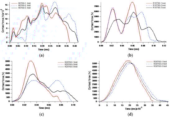 Contact force versus time (F−t) curves after repeating impact tests of composites sintered for 60 minutes: (a) Fe + 5 vol.% B4C (R5T60); (b) Fe + 10 vol.% B4C (R10T60); (c) Fe + 20 vol.% B4C (R20T60); (d) Fe + 30 vol.% B4C (R30T60).