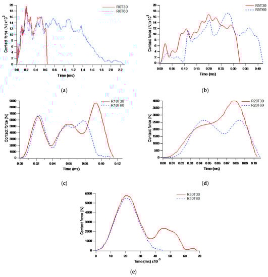 Variation of contact force versus time (F−t) curves for: (a) un-reinforced iron specimen sintered for 30 min and 60 min (R0T30, R0T60); (b) Fe + 5 vol.% B4C sintered for 30 min and 60 min (R5T30, R5T60); (c) Fe + 10 vol.% B4C sintered for 30 min and 60 min (R10T30, R10T60); (d) Fe + 20 vol.% B4C sintered for 30 min and 60 min (R20T30, R20T60); (e) Fe + 30 vol.% B4C sintered for 30 min and 60 min (R30T30, R30T60).