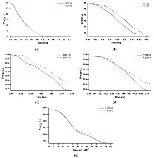 Variation of energy versus time (E−t) curves of impactor for: (a) un-reinforced iron specimen sintered for 30 min and 60 min (R0T30, R0T60); (b) Fe + 5 vol.% B4C sintered for 30 min and 60 min (R5T30, R5T60); (c) Fe + 10 vol.% B4C sintered for 30 min and 60 min (R10T30, R10T60); (d) Fe + 20 vol.% B4C sintered for 30 min and 60 min (R20T30, R20T60); (e) Fe + 30 vol.% B4C sintered for 30 min and 60 min (R30T30, R30T60).