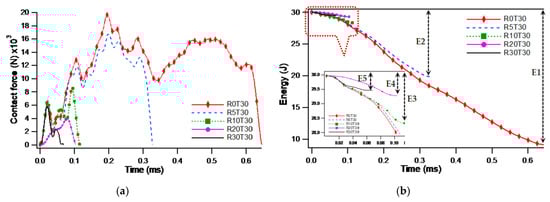 Comparison of 30 min sintered test specimens for: (a) contact force−time (F−t); (b) energy-time (E−t) curves of impactor; the inset is a magnification of the region indicated by the red dashed line.