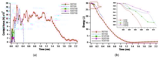 Comparison of 60 min sintered test specimens for: (a) contact force−time (F−t); (b) energy−time (E−t) curves of impactor; the inset is a magnification of the region indicated by the red dashed line.