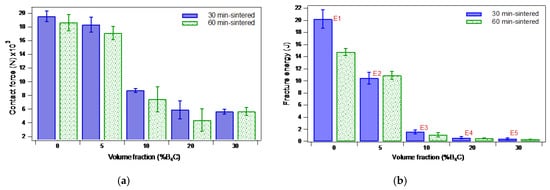 Figure 17 shows the category plots of maximum contact forces and fracture energy with respect to the reinforcement ratios and sintering duration. Both the maximum force and the absorbed energy values decreased with increasing volume fractions for each sintering duration.