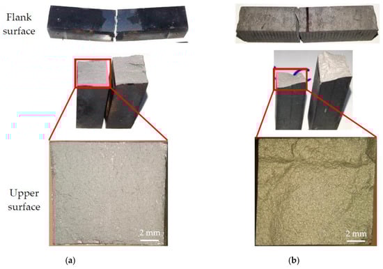 Images of the fractured test specimens from the flank and upper surfaces: (a) un-reinforced (R0T60); (b) Fe + 20 vol.% B4C (R20T60) composite.