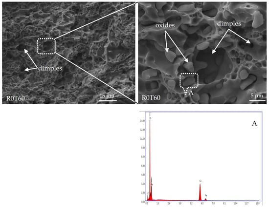 The fracture surface of the un-reinforced specimen is characterized by the presence of intensive dimples, as shown in Figure 19. Dimples were observed randomly on the fracture surface, and fracture damage occurred as a result of the combining of these dimples during crack propagation. In addition, oxide formations with a spherical geometry were also observed in the SEM images and proved with EDX analysis, as seen in Figure 19. These oxides, which may be formed during surface polishing processes, are difficult to distinguish from oxides formed during the fabrication process of specimens and come from raw powder.