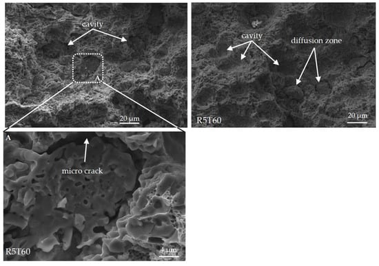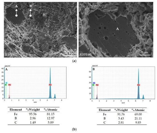 It was observed that distinctive cavities occurred when the diffusion zones separated from the matrix surface (Figure 20). If a crack is obstructed by a well-bonded matrix, diffusion zones, or residual particles, it tends to remain constant or to spread around the particle or diffusion zone. If the interfacial adhesion is strong between the matrix and the reinforcement particle interface, damage will occur by breaking the harder regions in the composites. Microcracks were also observed around hard diffusion zones, as confirmed by the SEM images of the R5T60 specimen in Figure 20 (Area A). The magnified region of A in Figure 20 refers to the transgranular fracture of the hard diffusion zone, which encircled the microcrack. In Figure 21, point A refers to a brittle-type fracture with a sharp crack in the iron matrix. The EDS analysis also revealed the difference between the borided zone and the iron matrix on the fractured Fe + 10% B4C test specimen seen in Figure 21b.