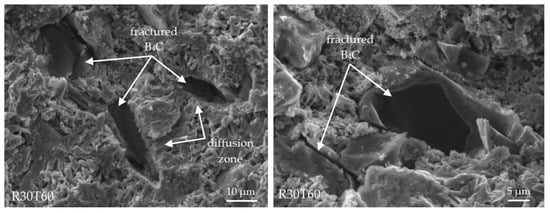 Figure 22 shows the fracture surfaces of the R30T60 specimen. The diffusion zones can be easily distinguished in the fractured surface around residual B4C particles with their acicular- and columnar-shaped morphology. Residual B4C particles fractured and broke into pieces under impact loading, as seen in Figure 22. Residual particles and such fracture types were not observed in composites reinforced below 20 vol.% B4C.