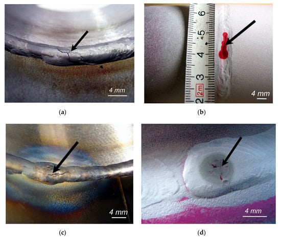 Examples of welding imperfections identified after the preliminary welding tests (a) and (c) crack form the root; (b) and (d) cracks from the face. The arrows mark the cracks.