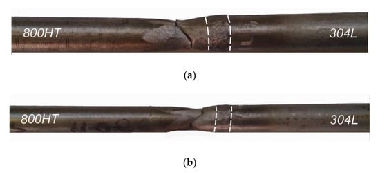 Despite the fact that the hardness distribution (Figure 18) indicates a reduction in the hardness in HAZ of austenitic steel, both samples were fractured in Incoloy 800HT base material (Figure 4). This is not a typical result, but has already been reported in the literature for dissimilar joints of nickel alloy and austenitic stainless steel [].