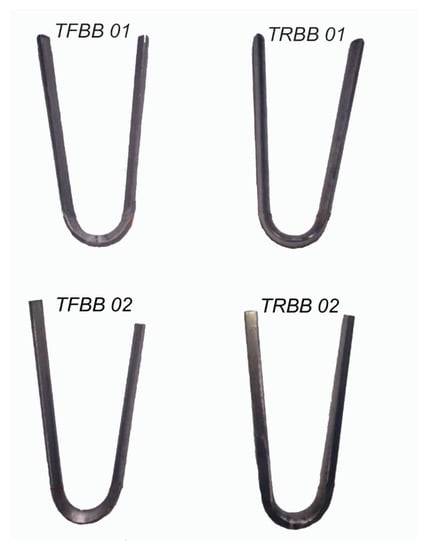 A bending test was carried out to determine the plastic properties of the welded joint. In addition, it is a test that reveals welding imperfections in the joint, e.g., lack of penetration, incomplete fusion, pores, etc. Two specimens were prepared for tensile the face (TFBB) and the root (TRBB) of the weld. A view of the specimens after bending is shown in Figure 5.