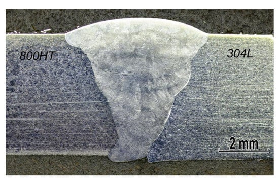 The literature contains scientific reports of research on the performance of austenitic stainless steel–nickel alloy dissimilar joints [,,,,,,,]. However, to the best of the author’s knowledge, the proposed material combination (304L austenitic stainless steel and Incoloy 800HT nickel alloy) has not yet been described. The available literature indicates that the subject is still relevant from a scientific point of view, and even more so from a practical point of view, with the possibility of applying the proposed solution to industrial conditions. The present work seeks to investigate the structure-property relationship in 304L austenitic stainless steel–Incoloy 800HT nickel alloy dissimilar joints made with the TIG welding process and a nickel alloy filler metal.