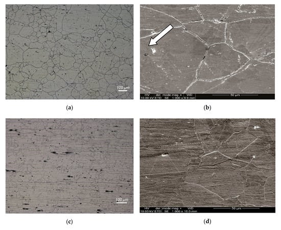 Metallographic structure of (a) Incoloy 800HT nickel alloy–optical microscopy; (b) Incoloy 800HT nickel alloy–electron microscopy; (c) 304L austenitic stainless steel–optical microscopy; (d) 304L austenitic stainless steel–electron microscopy.