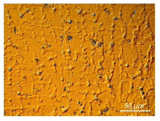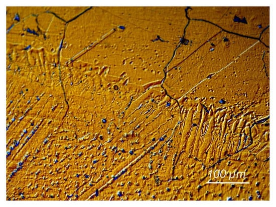 In the transition zone between the weld and Incoloy 800HT (Figure 10), columnar dendrites appearing towards the base material are visible. This may be due to the lower thermal conductivity of the Incoloy 800HT alloy (11.5 W/mK) compared to 304L stainless steel (14.0–16.3 W/mK). This leads to a slight dissipation of heat introduced during welding and the formation of the observed dendrite arrangement. Such changes were also observed by other researchers in welded joints of nickel alloys with austenitic stainless steel [,]. In the direction of the base material, melting of its grains and the epitaxial crystallization area, a transition of the dendritic structure of the weld in the crystallographic direction of the base material was observed. In the fusion zone, the grain shape of the primary structure (base material) can be observed. This type of crystallization is associated with relatively low thermal conductivity, low heat dissipation and a high density of the liquid metal. In the case oftransition zone: weld–304L stainless steel, this structure was not observed. However, areas with significant changes in morphology were identified, as revealed using the Nomarski contrast (Figure 11). Clearly defined spaces on the fusion line show the occurrence of high-temperature δ ferrite. Their intensity is associated with the higher thermal conductivity coefficient of 304L compared to the Incoloy 800HT and the welding position (H-L045), which generates varied heat distribution along the fusion line. Hence, the δ ferrite-rich zones do not occur along the entire length. The analyzed areas, despite structural and morphological differences, did not reveal imperfections in the form of microcracks or the formation of eutectics, which can be the result of introducing oxides or organic contaminations into the welding pool. No chromium carbide precipitations—that could lead to intergranular corrosion—were observed, which could result from the heat input during welding in the H-L045 position.
