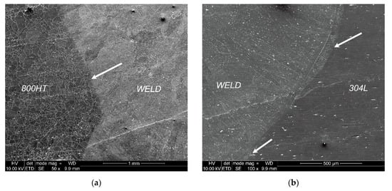 Changing the arrangement of dendrites into columnar and their increase occurred in zones adjacent to the base material. Figure 9a,b show a view of the joint areas: Incoloy 800HT–fusion line–weld and weld–fusion line–304L stainless steel (white bands visible also in Figure 6). There are significant differences between the morphology of the fusion line and the HAZ for both materials (indicated by arrows), which is in accordance with the available literature []. From the Incoloy 800HT side, there is no clearly defined HAZ (type A fusion boundary); only at larger magnifications, a smooth transition of the weld metal into the base material can be observed (Figure 10). The morphology of the area between 304L stainless steel and the weld is different (type B fusion boundary). The areas of the smooth transition of weld to base material were observed, but there were also the zones of different morphologies (marked by the arrow in Figure 9b) which may indicate structural changes in this area. In order to analyze them, microscopic examinations (Figure 10 and Figure 11) were performed with higher magnification and the application of DIC (Nomarski contrast).