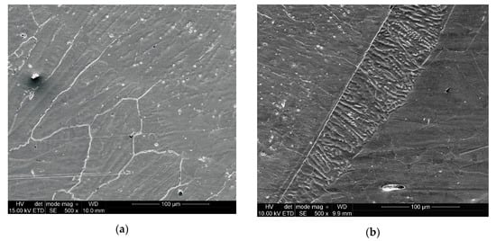 The identified cracks occurred from the root side (Figure 2a,c) and the face side (Figure 2b,d) of the weld. Their shape is characteristic for hot cracks, i.e., they extend along the axis of the weld (Figure 2a,b) and propagate out from the center of the weld at its end (Figure 2d). The analysis of the welding process showed that the welding technique characteristic for austenitic stainless steels was one of the causes of the formation of this type of imperfection. It was changed through the use of straight beads, the distribution of liquid metal by mixing with a filler, making joints with an excess weld metal and filling the end crater with reinforcement. In addition, after each bead, the oxidized filler tip was cut off to eliminate the introduction of oxides into the liquid metal pool, which was not done for preliminary joints. This limited the appearance of liquid and brittle film from the segregation of impurities, which is one of the causes of crack formation []. The applied changes also led us to verify the welding parameters, which resulted in a decrease in the heat input. Those modifications brought positive results and allowed us to accept welding parameters. Test joints were made according to the parameters shown in Table 4. Five specimens were made: two were subjected to tensile tests, two to bending tests and one for other structural tests and microhardness measurements.