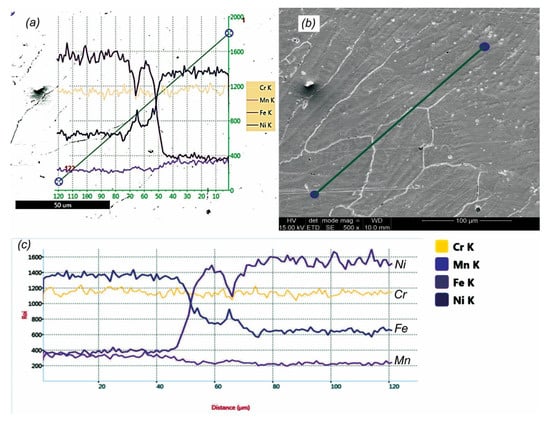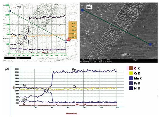 Results of EDS linear analysis for the zone: 304L austenitic stainless steel (a) distribution of elements against the background of the structure with the measuring line marked; (b) microstructure of the weld area–HAZ–304L austenitic stainless steel with the line according to which the elements were measured; (c) linear distribution of elements.