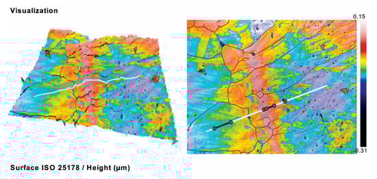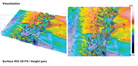 Microscopic metallographic examinations revealed differences in the structure of the transition areas between the weld and the base materials; therefore, a profile analysis of the morphology of the surface of the transition areas was carried out using a confocal microscope. The obtained results are shown in Figure 15 and Figure 16 and in Table 6.