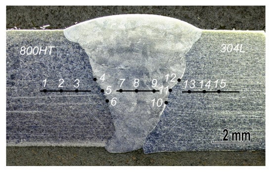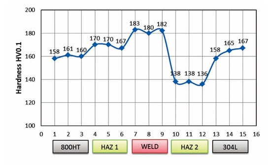 Due to the different physico-chemical properties of the base materials and consumables, dissimilar welded joints are usually characterized by significant structural inhomogeneity, both in terms of technological and operational properties. Depending on the grades of stainless steel and nickel alloy, the hardness measurements of the welded joint show similar values for both base materials [,] or an increase in the fusion zone from stainless steel towards nickel alloy [,]. Wang et al. stated that in the case of 316L stainless steel/Inconel 182 dissimilar welded joints investigated in a high temperature and high-pressure water, different types of fusion boundaries had different surface potential values, and that the corrosion behavior was related to potential value changes between two sides of fusion boundaries [].