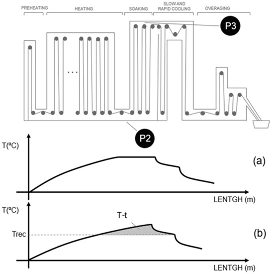 Figure 1 shows the layout of the annealing furnace and the traditional thermal cycle (Figure 1a), where the peak temperature is achieved at point P2. The revamping of the annealing furnace of a galvanizing line meant the redesign of the thermal cycles for the product mix produced. Figure 1b shows the new cycle without soaking, where the peak temperature is achieved at point P3. In the case of the High Strength Low Alloyed (HSLA) steels, it was necessary to introduce a new control parameter to ensure the mechanical properties, called the time–temperature [1], and its value corresponds to the area comprised in between the thermal profile and the recrystallization temperature, Trec with a value of 725 °C, as is shown in Figure 1c.