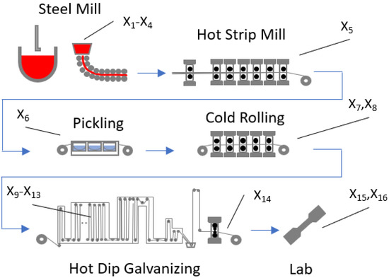 Fifty-two process parameters from Steel Mill, Hot Strip Mill, Pickling Line, Cold Rolling Mill, and Hot Dip Galvanizing line were collected and organized from the different databases. These parameters included the chemical composition of the coils and the main process parameters of each installation (processing speeds, temperatures, forces, tensions, reduction rate). Figure 2 shows the different stages of the process and where the variables used in the models are obtained. The data correspond to the period 2018–2019. The data were filtered to select the coils belonging to HSLA260 and HSLA300 grades and all registers with zeros in the YS, UTS, or any of the process parameters were removed to obtain the final datasets.