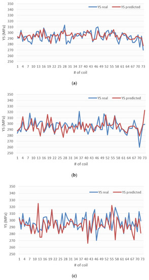 The results of the tested models are satisfactory since the errors are below 11 MPa, which is aligned with the obtained in other studies [29]. It can also be observed that the MAE is quite similar using the four different models; the reduced number of samples could be a drawback for improving the accuracy of some of these models. It is also observed that the trend of obtaining errors in the prediction of the UTS in the case of HSLA260 is lower than in case of HSL300. It seems that the difference is more related to the stability of this property in this grade than to the number of samples, because the errors in the prediction of the YS are similar for both steel grades.