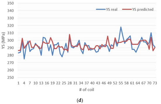 Plots of the real yield strength YS and the predicted YS calculated with the test dataset 2B for: (a) linear learner, (b) polynomial learner, (c) Neural Network learner, and (d) Multivariate Adaptive Regression Splines MARS learner.
