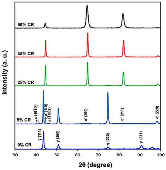 The XRD patterns of the as-received and 5%, 25%, 35% and 90% cold-rolled specimens are presented in Figure 2. The microstructure of the 5% cold-rolled sample consisted of γ-austenite, α′-martensite and ε-martensite phases.