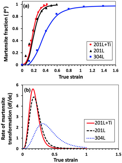 Figure 3a illustrates the calculated volume fraction of SIM (ƒα′) as a function of true strain (ε) in comparison with 201L [15] and 304L [16] ASSs. As can be seen, martensite formation follows a curve with sigmoidal shape so that it rapidly increases and becomes saturated at a specific strain (εs). εs plays an important role in attaining nano/ultrafine-grained structure in subsequent reversion treatment of the cold-rolled ASSs [15,23,24]. The volume fraction and grain refinement of reverted austenite are also depended upon the εs.