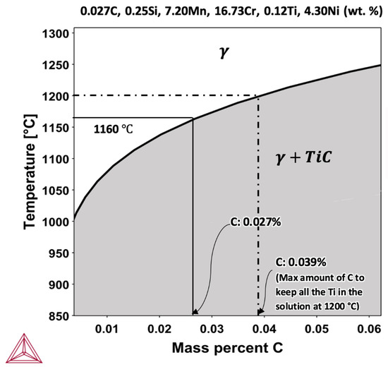 It can be attributed to the presence of Ti affecting the stability of austenite. It has been reported that the addition of Ti to the 316 steel decreases its SFE [25]. In addition, precipitation of Ti-rich phases may affect the austenite stability. For example, during solution annealing at 1200 °C, the TiC carbides formed during solidification may dissolve incompletely and remain in the matrix. Therefore, the retained TiC may lead to the depletion of C in the austenite, resulting in a lower SFE and consequently an enhanced susceptibility to SIM formation. The thermodynamic calculation (Figure 4) shows that, for the studied composition, Ti solubility temperature is about 1160 °C, which is below the solution treatment temperature; however, a slight level of segregation during solidification, which is very common in this alloy due to high amounts of silicon, manganese and alloying elements, will increase Ti solubility temperature and possibility of undissolved TiC during the solution treatment.
