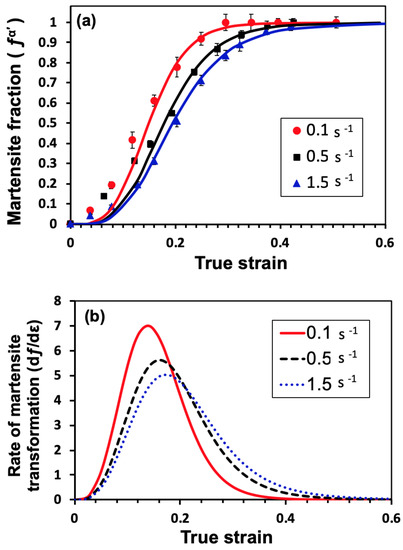 The rate of SIM formation at different strain rates is shown in Figure 5b. By increasing the strain rate, the rate of SIM transformation decreases, and the maximum value shifts to a higher strain value. The values of strain related to the maximum transformation rate for the specimen rolled at the strain rates of 0.1, 0.5 and 1.5 s−1 are 0.14, 0.16 and 0.18, respectively. As mentioned before, at high strain rates the adiabatic heating increases the austenite stability, restricting the transformation.