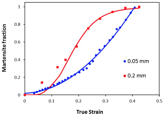 Further reductions produce parallel shear bands, and finally after a critical strain level, numerous intersections form between them, which enhances the martensite fraction significantly. However, this is a theoretical hypothesis, and supplementary experiments such as transmission electron microscopy could be employed to confirm or even reveal some other aspects and provide a better understanding of the mechanism. It is worth mentioning that there is a discrepancy between the experimental values and the fitted curves at low strain levels, as can be observed in Figure 3a, Figure 5a and Figure 6. This discrepancy in the beginning of the curves—which has also been observed in several other cases, in [15,16], for example—suggests that the Olson and Cohen model does not fit perfectly for strains below 15%. Maybe the inhomogeneous dispersion of SIM at low stain level affects the ferritescope and XRD measurements which are actually local measurements. But with increasing the applied strain which makes the dispersion of SIM more uniform, the discrepancy decreases, and the model fits very well. It is interesting that no discrepancy was observed for the thickness reduction of 0.05 mm per pass, though the fitted curve is different in that case. This can be attributed to the low strain level per pass and insignificant stress concentration resulting in more homogenous dispersion of SIM.
