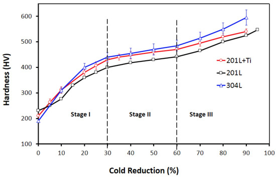 It should be remarked that the microstructural evolution during deformation is a continuous process so that these stages during hardening may have some overlaps. An interesting feature to note is that, for the three steels, the onset points of stages II and III occurred at ~30% and ~60% thickness reduction, respectively. This concept that is consistent with other observations elsewhere [26], which suggests that transition of martensite structure is not as dependent on chemical composition as the SFE. However, the exact locations of the critical points in the plots are difficult to define because of limited numbers of data points. Finally, the evolution of microstructure during cold rolling of ASSs at room temperature is summarized by schematic illustrations in Figure 8.