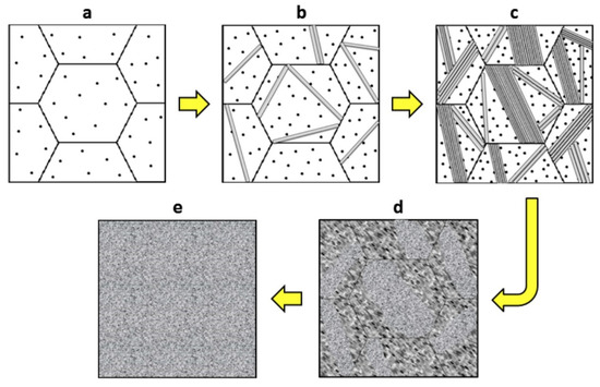 Schematic illustration of microstructural evolution during cold deformation of ASSs through the sequence of (a) initial equiaxed austenite grains, (b) an increase in dislocation density in γ phase and the initiation of SIM formation, (c) decrease in lath width and packet size of SIM, (d) transition of lath-type martensite to dislocation-cell-type martensite simultaneous with increase in dislocation density and formation of fresh SIM and (e) spreading of dislocation-cell-type martensite.