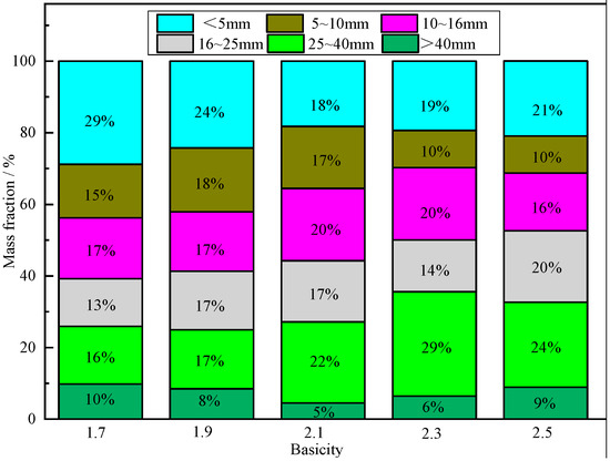 The size distribution of HCVTM sinter with different basicity is shown in Figure 2. The proportion of particles with a size bigger than 16 mm increased from 39% to 53% with the basicity increasing from 1.7 to 2.5, which indicated that the particles of HCVTM sinter were mostly large particles. The increase of the liquid phase and the sinter strength were the reason for the larger particle formation.