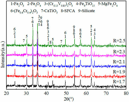 According to the analysis of the XRD pattern of the HCVTM sinters (Figure 3), the main mineral phases of the HCVTM sinter were magnetite (Fe3O4), hematite (Fe2O3), perovskite (CaTiO3), etc. The peak intensity of perovskite became stronger with the basicity increase, and the silico-ferrite of calcium and aluminum (SFCA) was generated as the basicity reached 2.3. Meanwhile, the magnesium ferrite (MgFe2O4) was generated because of the similar ionic radii of Mg2+ (0.78 Å) and the Fe2+ (0.83 Å). Several low-intensity peaks appeared, which can be attributed to the solid solutions of (Fe0.6Cr0.4)2O3 and (Cr0.15V0.85)2O3.